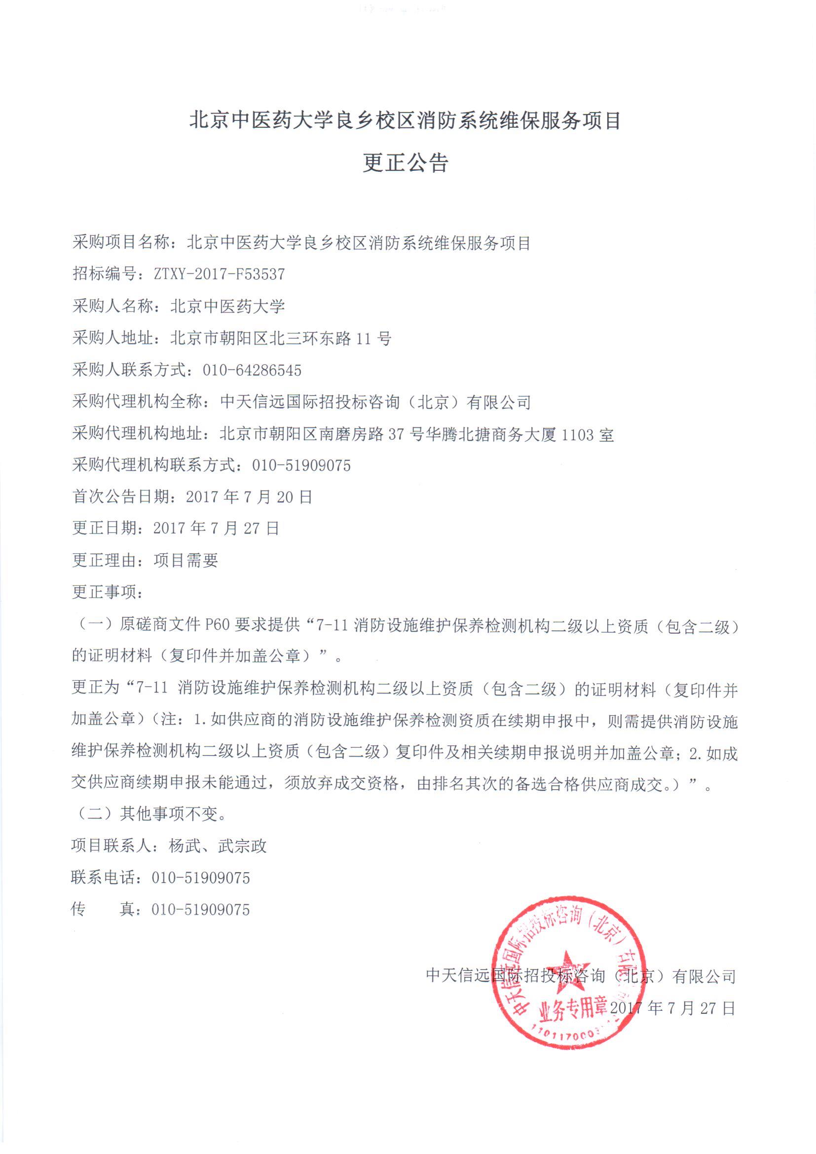 原公告项目名称:北京中医药大学良乡校区消防系统维保服务项目竞争性磋商