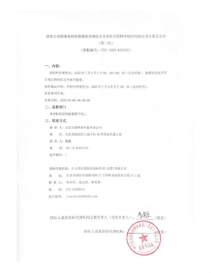 深度合成图像视频检测溯源关键技术及实际互联网环境应用验证项目更正公告(第二次)