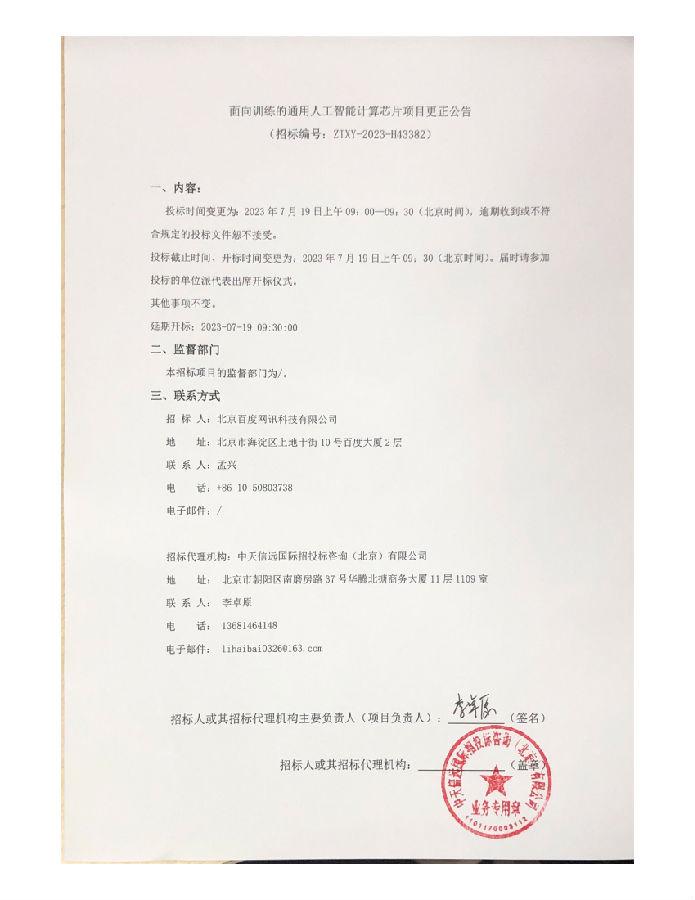面向训练的通用人工智能计算芯片项目更正公告