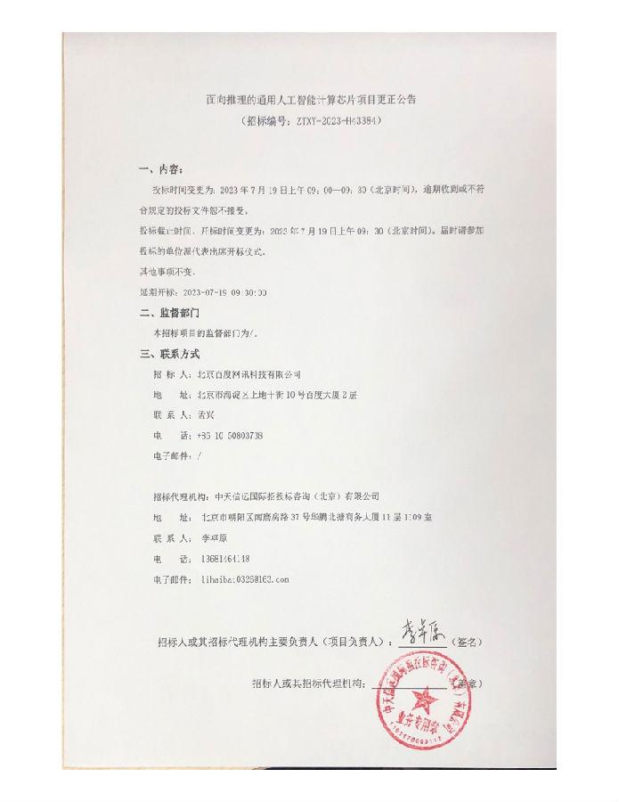面向推理的通用人工智能计算芯片项目更正公告