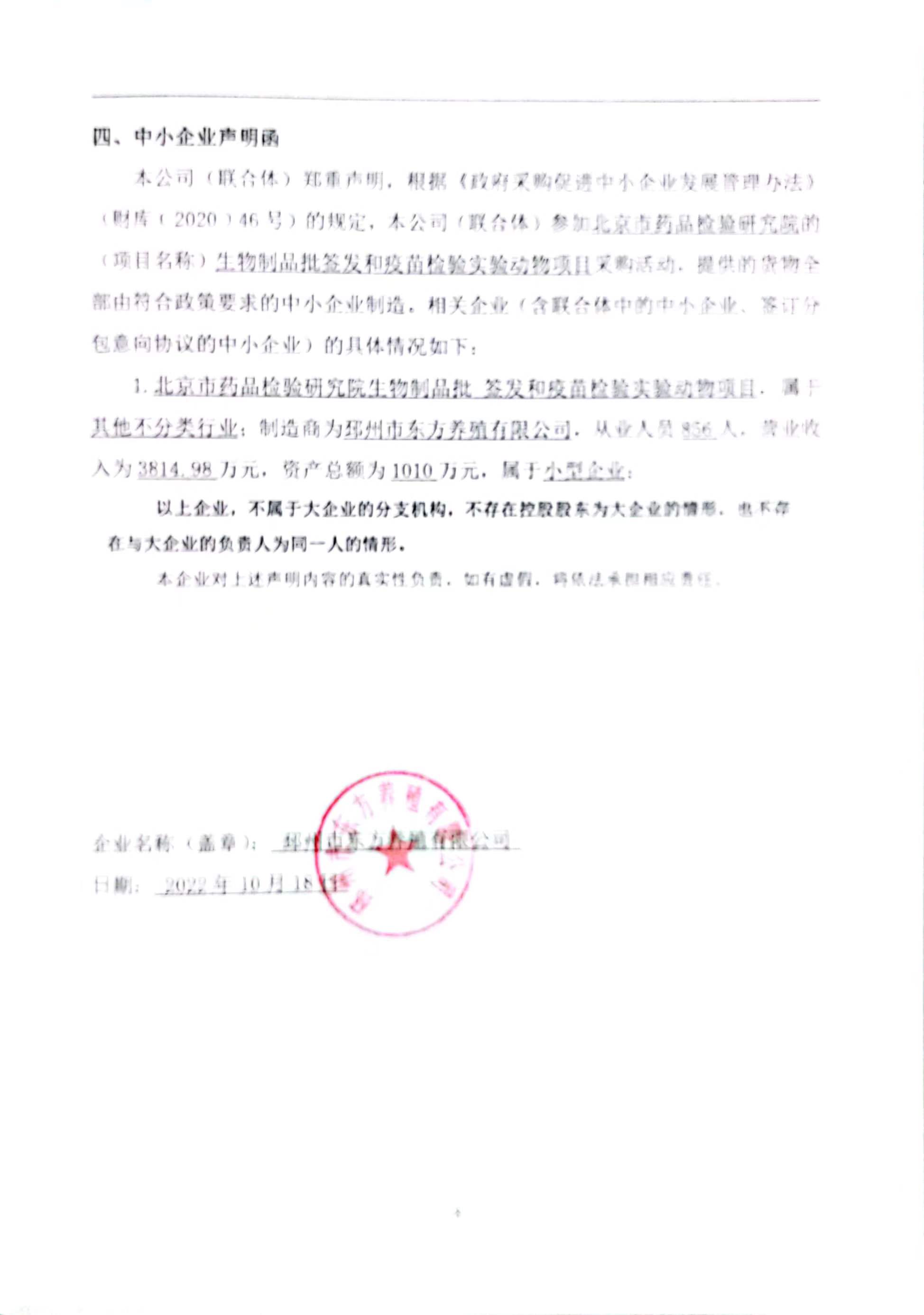 简要技术要求:为采购人提供生物制品批签发和疫苗检验实验动物项目的全部实验动物(兔/大耳白),具体要求详见招标文件第五章采购需求。