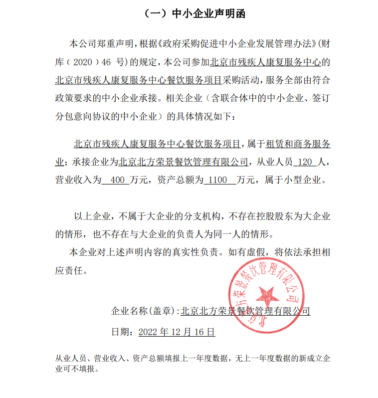 | 北京北方荣景餐饮管理有限公司 | 北京市残疾人康复服务中心餐饮服务项目 | / | 1 | 46.65万元 | 46.65万元 | 为北京市残疾人康复服务中心提供餐饮服务,具体内容详见竞争性磋商文件。 |
