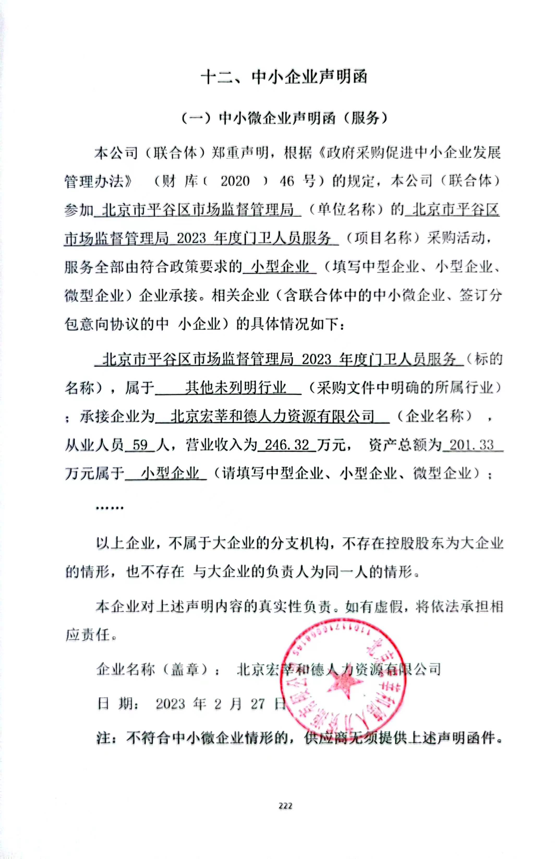 | 1 | 北京宏莘和德人力资源有限公司 | 北京市平谷区市场监督管理局2023年度门卫人员服务 | 北京市平谷区市场监督管理局2023年度门卫人员服务 | 具体内容详见竞争性磋商文件第四章要求 | 服务期:一年(具体时间以合同为准) | 具体内容详见竞争性磋商文件第四章要求 |