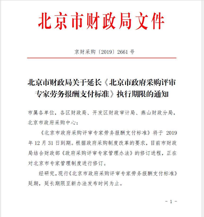 北京市财政局关于延长《北京市政府采购评审专家劳务报酬支付标准》执行期限的通知