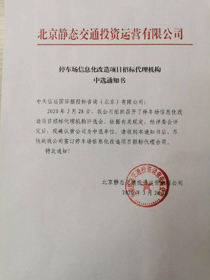 关于停车场信息化改造项目招标代理机构评选中选通知