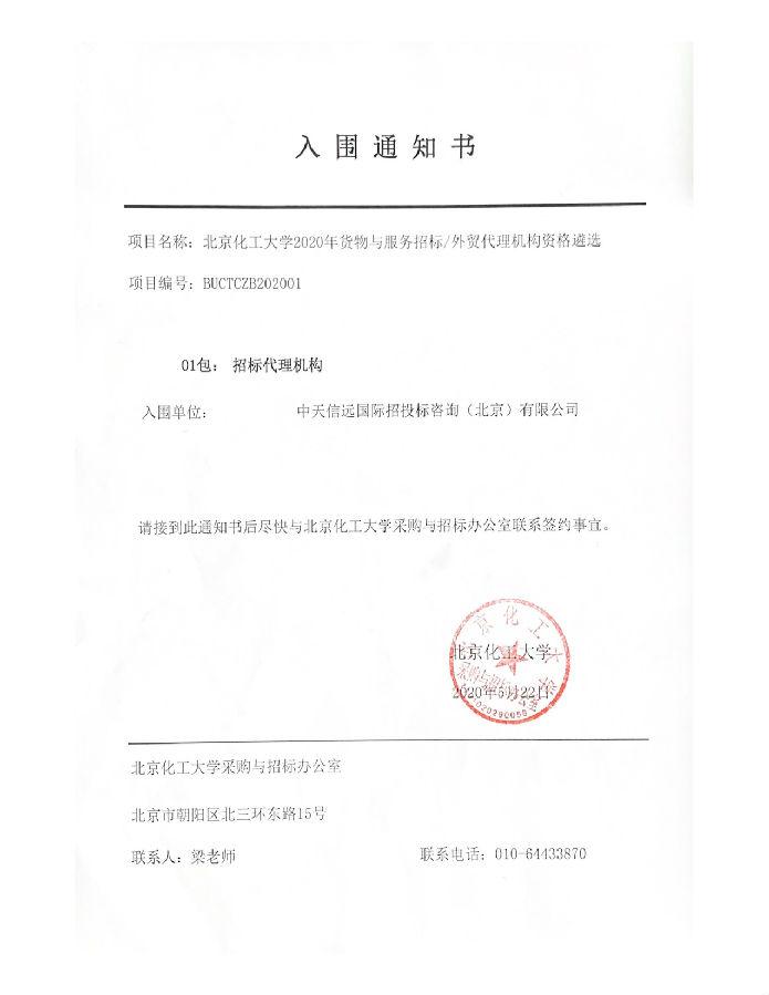 北京化工大学2020年货物与服务招标/外贸代理机构资格遴选入围通知书