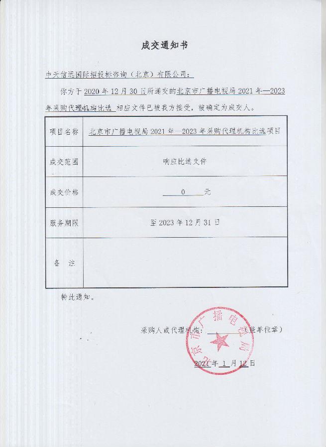 关于北京市广播电视总局2021-2023年采购代理机构比选成交通知书