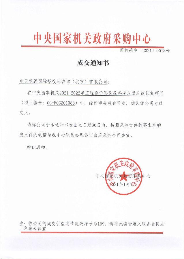 中央国家机关2021-2022年工程造价咨询服务定点供应商成交通知书