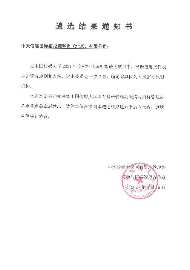 中国传媒大学2021年度招标代理机构遴选结果通知