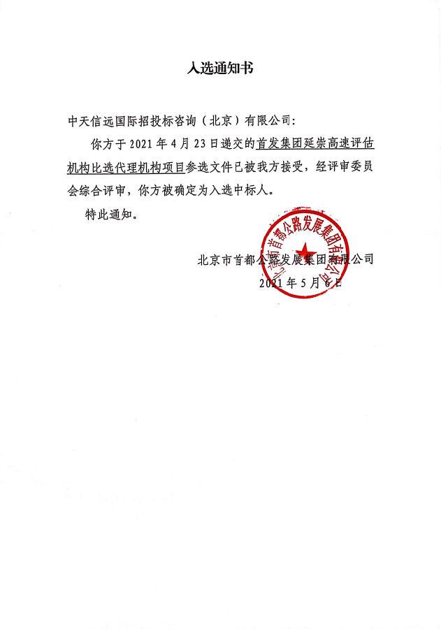 关于首发集团延崇高速评估机构比选代理机构项目入选通知书